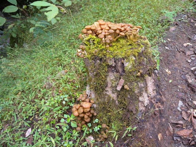 探してる時は見つからず、養魚場へ戻って、「さて、困ったな〜」と、池の縁に腰掛けたら、2m前の切り株に、ドッチャリ出ているじゃありませんか。