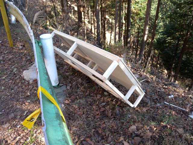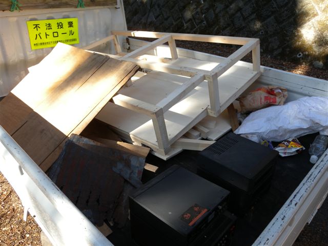 昨日の事ですが・・。 お酒を飲んでいる訳じゃなし、餅を食べ過ぎてる訳でもないが、身体がナマッているので、ドライブする事にした。 しかし、一人で、ただのドライブじゃ芸がないので、ついでにゴミ掃除をする事にして、軍手と火バサミを持って行く。 クルマも、軽トラにした。 年末にゃ、ほとんどゴミはなかったが、三ヶ日に捨てに来る罰当たりも居る・・。 との予想通り、大洞トンネル先のガードレールに、ナンだか訳の解からない大物がぶら下がっている。 近づいて見ると、相当へたくそな出来栄えだが、ナンと手作りの「棚」だ。 しかも、一度も使ってない。 作ったまま、捨てたようだ。 オイラは、その粗大ゴミを、軽トラに回収する前に、しばし考えたね。 要するに、ブキな旦那が女房に頼まれて棚を作った。 ところが、出来上がった棚は、奥さんの指示する場所に、寸足らず・・ならぬ、寸オ〜バ〜で、入らなかった。 その上、奥さんから、下手だの、役立たずだのと罵倒され、元旦の日の出に女房に呪いを掛けるついでに、捨てていったのだろう。 かわいそうなダンナだが、棚板に使ってるコンパネが厚くて、道路下から持ち上げるのは結構重かった。 休暇で神戸に帰ってる、若者木村が戻ってからにすりゃ良かった。 ま、それでも、空き缶あり、ペットボトルあり、マックの袋の中は、コーヒーカップとジャガイモの袋か・・、結構の収穫があった。 しかし、正月早々、クルマの窓から、食べちゃポイ!飲んじゃポイ!ってのが、まだまだ居るんですね。 こういう人達って、自分のクルマの中は綺麗なんでしょうね。 棚を作った人の庭先なんて、たぶん、チリ一つ落ちてないと思います。