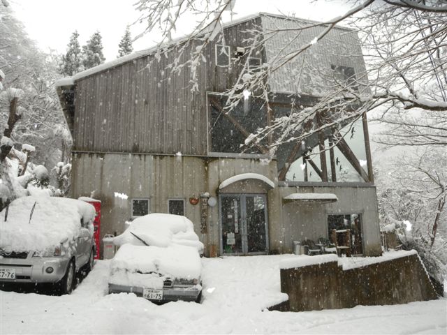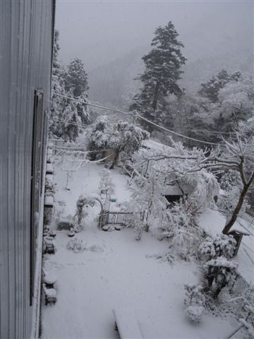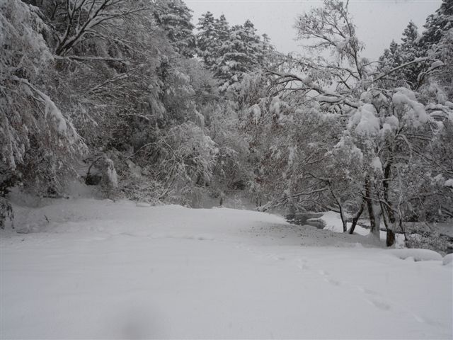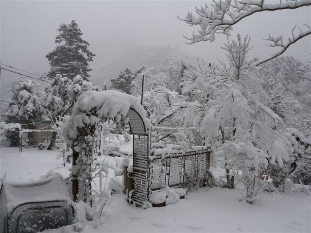 まあ、今日はそう言う話じゃありません。 いくら冬といえ、カラカラ天気が続いて、山の土も樹木も、「水くれ〜」と言ってました。 ついでに、私の喉もお肌も、ヒリヒリのガサガサ。 そこに待望の雪です。 前出の女の子予報士の話しでした。 朝方は10cmそこそこでしたが、お昼頃には30cmほどになりました。 雪景色はいいですね、きれいな真っ白な雪が、すべてを覆っていきます。 そして、何故か解かりませんが、とても静かになります。 階段の下で燃えるストーブの中で、薪のはぜる音が聞えるのも、雪の日だけのように感じます。