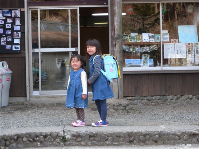 そこへ、突然、天使の羽です。 可愛い孫(モドキ)が、ランドセル背負って、名札も付けて、小屋の前で新一年生のお披露目です。 ココまで来たご褒美に、あま〜いジュースをご馳走しました。