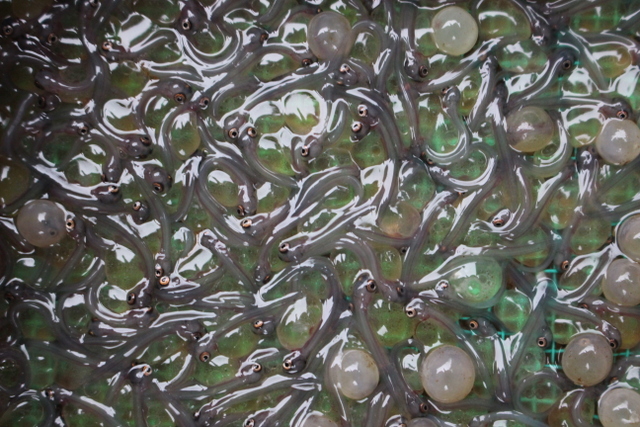 雨上り、卵を洗うため孵化盆を取り上げたら、元気なヤマメが孵化していました。 昔〜し、「エ〜、食べたら美味しそう。踊り食いしたい。」と言った、不届きな看護婦(当時の呼び名)がいました。 可愛いじゃないですか。コレ食べられますか・・。 ・・って、でも、腰越の生シラスは美味しいです。