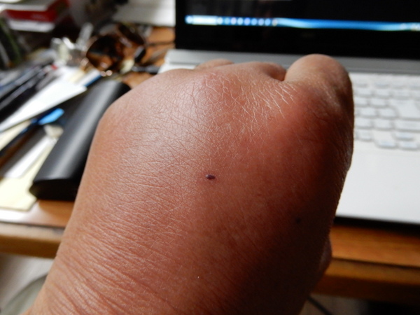 右手の指でピン!と弾けば良かったのに、手を振ったのがいけなかった。 ブッスリ刺していった。