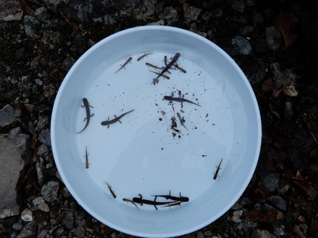昨年と比べると沢の水量が少なくサンショウウオの居場所が昨年と違います。 最初に見つけたのはナンとアイネにカオンにサホの3人組です。 大きなサンショウウオでした。