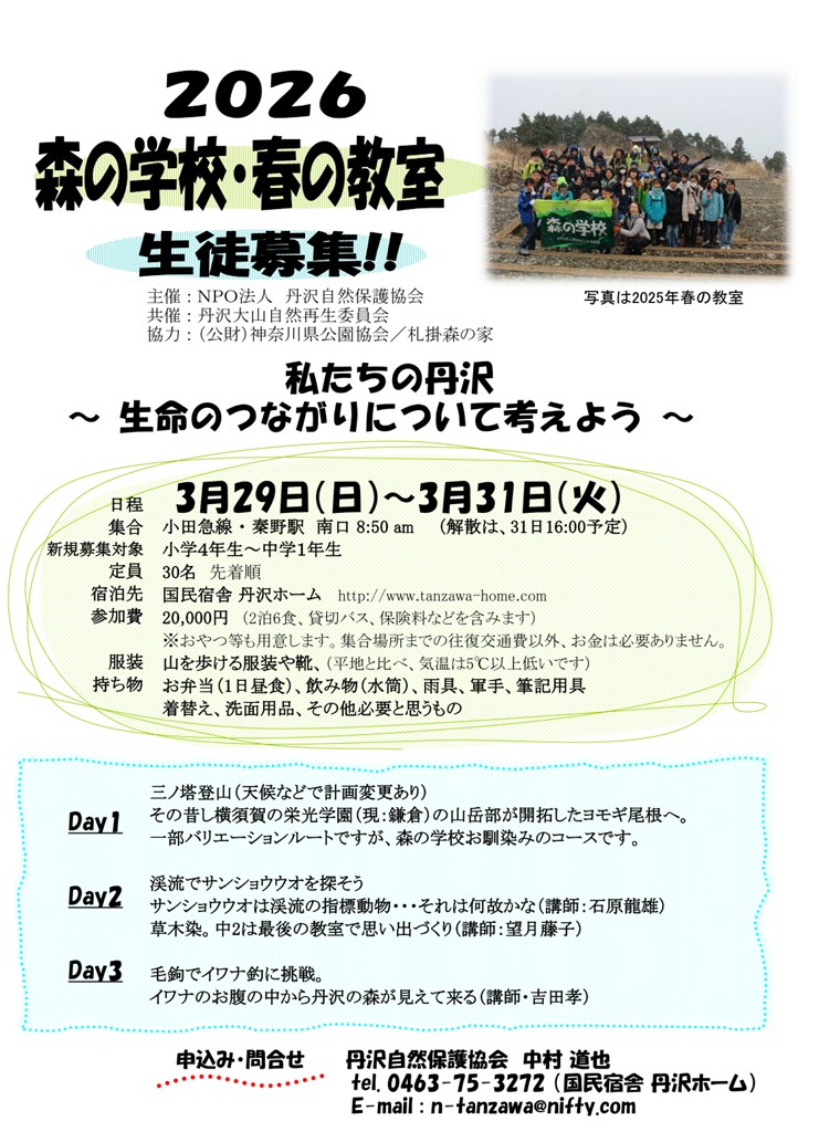 「森の学校」は、随時参加者を募集しています。 参加資格は小学4年生〜中学1年生です。 (卒業生は年齢資格に限りません) 学齢前でも保護者がついていれば参加できます。 ・問い合わせ・申し込み 丹沢自然保護協会・丹沢ホーム(中村)まで。 |