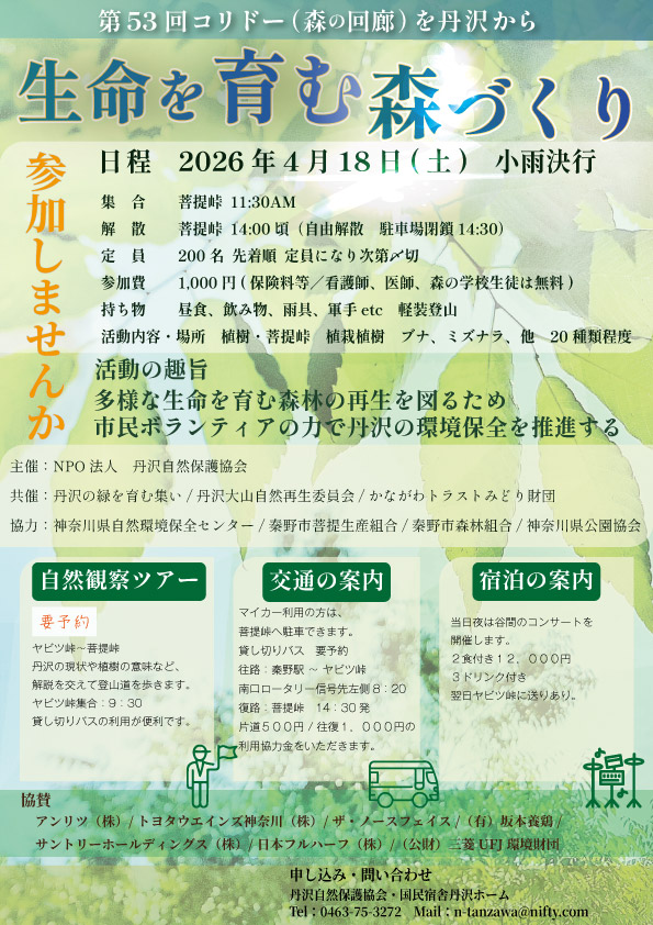 第53回 コリドー(緑の回廊)を丹沢から 募集は3月10日から受け付けます。 画像クリックでPDF資料(1.1M)のダウンロードが行えます。 ![]() 画像クリックでPDF資料(1.3M)のダウンロードが行えます。 ![]() |