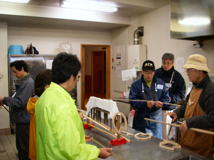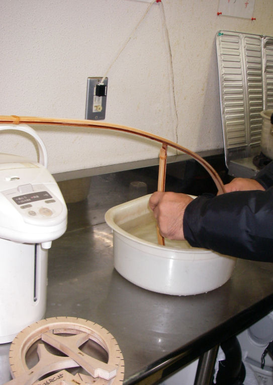 フレーム材を熱湯につけて、フレームの形に合うように曲げていきます。 |