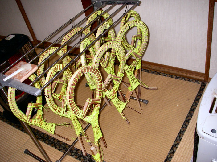 曲げたフレーム材を型にあてて糸で固定し、形状を記憶させます。 |