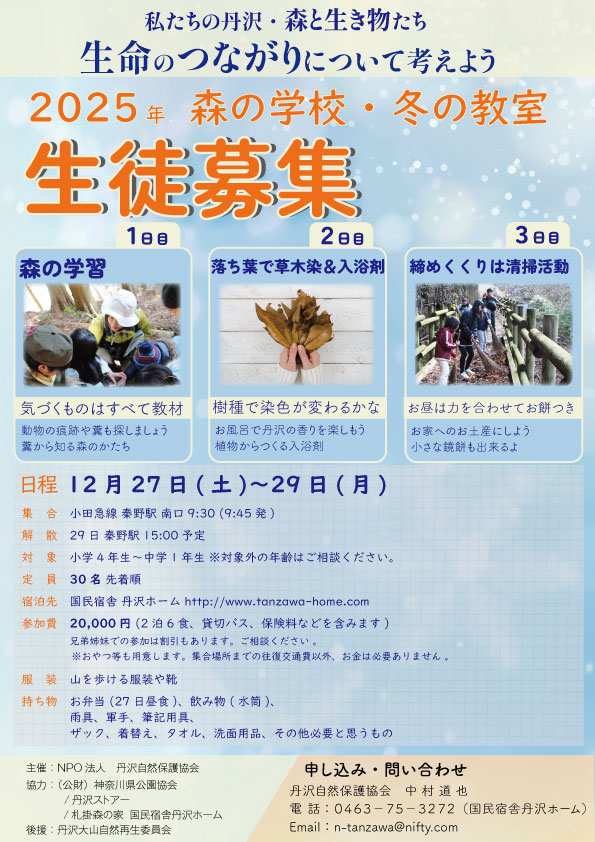 〜森の学校〜 冬の教室 参加者募集 <PDF ダウンロード(230kb)> ![]() <PDF ダウンロード(583kb)> ![]() |