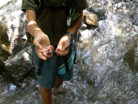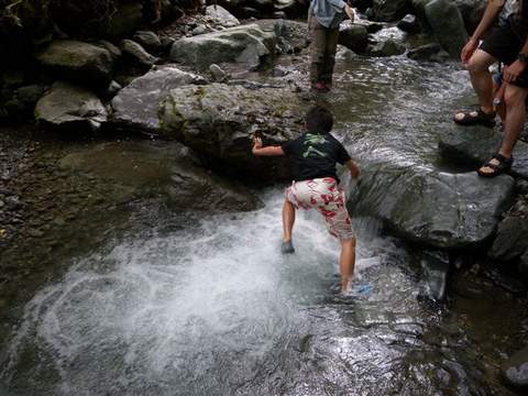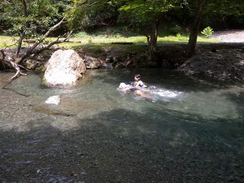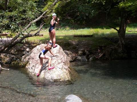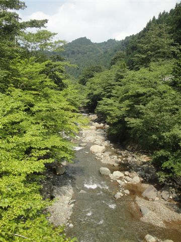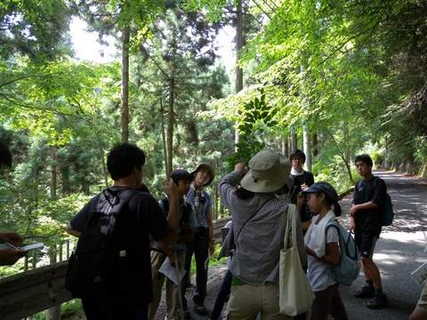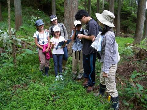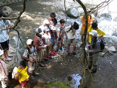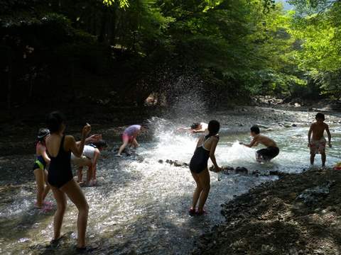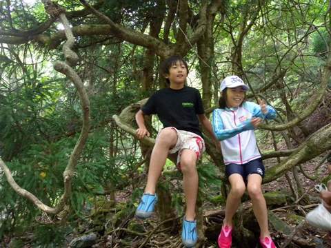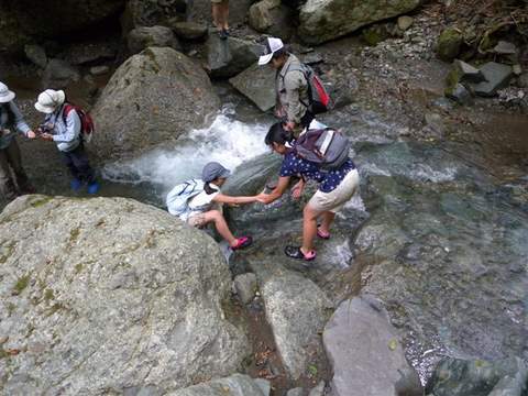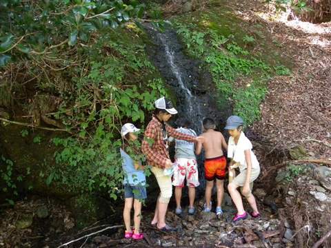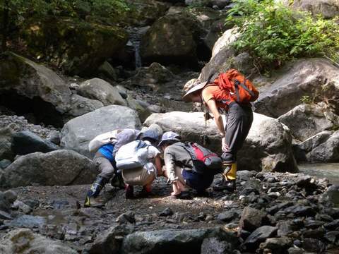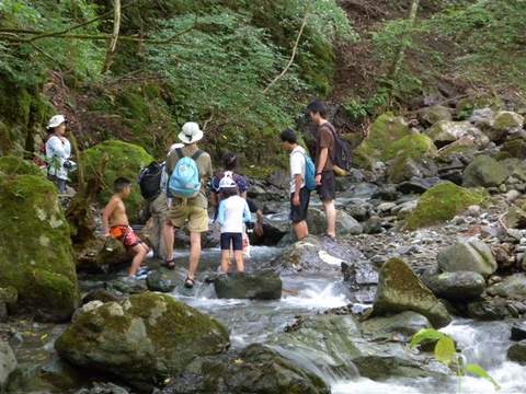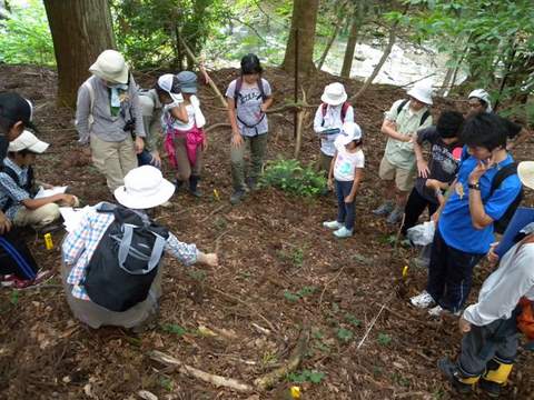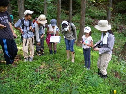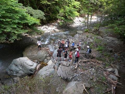 1日目 これから4日間、渓流と周辺の森「渓畔林」を学習します。 まず、橋の上から、渓流を包むような樹木「これが渓畔林だよ・・」。 二つのチ〜ムに分かれて出発。 水の中や石の上に、生き物の痕跡を探します。 渓流には、右や左から小さな沢が合流します。 イワタバコの紫の花がきれいです。 男の子二人・・ウ〜ッ!気持ちいい! 遊んだあとは、もちろん勉強。 渓流の水が冷たい理由が解かった!・・かな。