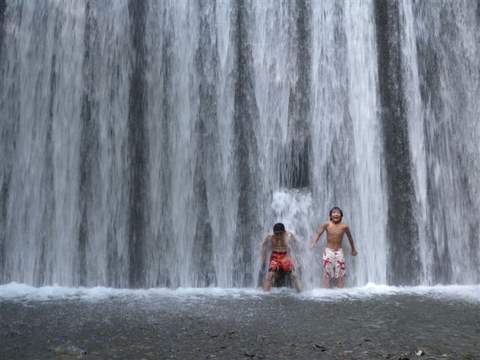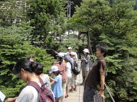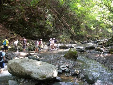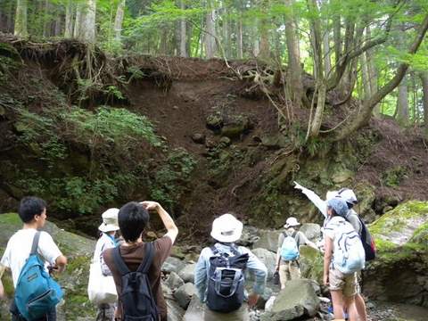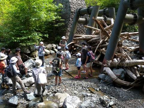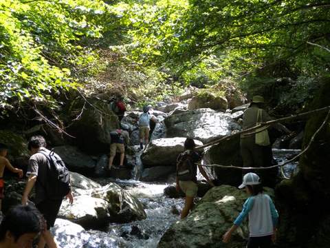 あまりの猛暑で、登山を中止。昨日の続きで、さらに上流を歩く事にしました。 出発前に、学習内容や注意点を話します。 7月20日の大雨で流出した流木がたくさんあります。 女の子二人、「何か見つけた?」・・かわいい沢蟹がいました。 元彌や、「もう裸か!」「だって、どうせ濡れちゃうなら、最初から裸がいい」 スタッフ見習いの高校生(森の学校現役OB)、ツルに捕まりタ〜ザンごっこをしています。 渓流の近くまで植えた杉林では、土が大きく抉られ、崩れていました。 それに比べ、広葉樹は根で石を抱え込み、強い流れにも耐えています。 大きな子は、小さな子の面倒を見ます。 危ない場所では手を貸します。 渓流の上に這う太いツルは自然の揺り椅子。 楽しそうだね。 僕は一番の収穫。「シカの骨と角を拾いました」 今日の目的地は、もうすぐです。 渓畔林の名前の通り、沢は木々に覆われ鬱蒼としてきます。 こんなトコにクワガタがいた!、かわいそうだから放してやれよ・・。 クワガタは、葉っぱの裏に無事帰る事ができました。 最後の学習場所、スリットダムです。 太い流木や大石が重なり、でも、水は上下で同じ高さを流れています。 スリットダムの効果が解かりましたか? 帰りは駆け足。 美味しいスイカが待っていました。