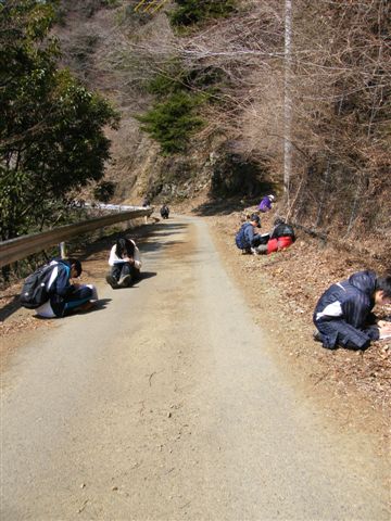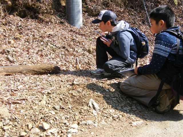 最終日は、林道に座って、「春探し」。目線の先には・・「いた!」
