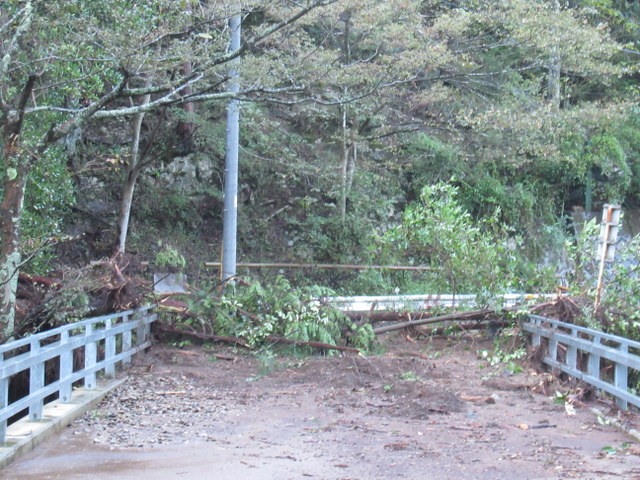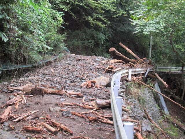 オマケに途中で数か所の崖崩れ、直径30cmほどの木が3本根ごと押し出され、その中に電柱が一本折れて道路の真ん中に立っています。