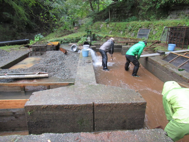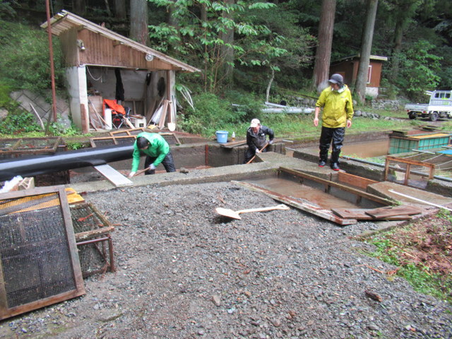まずは「お魚に水は命」と、養魚場を埋めた土砂を取り敢えず除去。