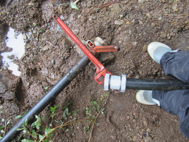 50mmのホースを右から10mほど手繰り寄せ、パイプレンチでスチール製ジョイントを締める。