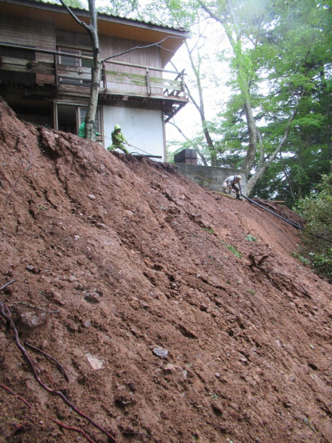 翌日に案の定、水道ホースは50m前後が山腹崩壊に伴い立ち木や土砂に埋もれています。