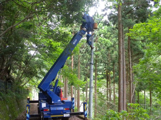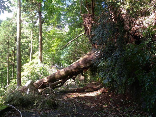 九州の報告もありますが、それは後ほどにします。 とりあえず、今日はこれで「おやすみなさい」です。 写真は、電線、ガードレールをズタズタにした憎っくき大木。 30tクレーン車のケツが持ち上がっていました。 電気の復旧で、今夜はお風呂に入れます。